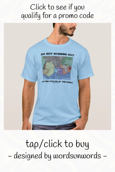 Showcase your wry plate tectonics attitude with this tee featuring a map of the world's tectonic plates along with the following sound earth scientific advice for anyone who has been in an earthquake: "Do Not Stress Out Over The Faults Of The World". myEarthScience