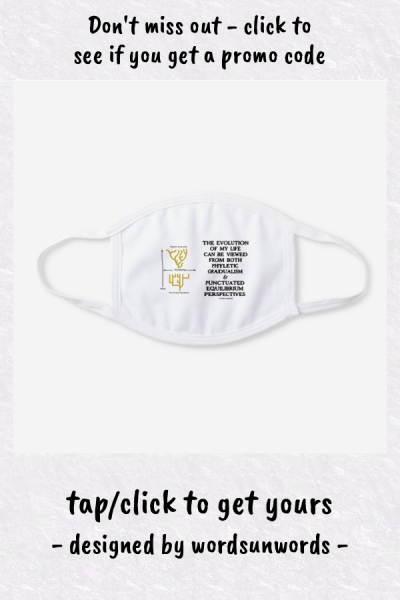 Cotton face mask for anyone who understands that one's own life can be viewed from both phyletic gradualism and punctuated equilibrium perspectives! Includes the following saying that will make others do a double-take: "The evolution of my life can be viewed from both phyletic gradualism and punctuated equilibrium perspectives." Memorable evolutionary psychology humor cotton face mask for anyone who knows about how one's life can be viewed from both phyletic gradualism and punctuated equilibrium perspectives. No need to be a biologist or geologist or paleontologist to enjoy! myEvolution