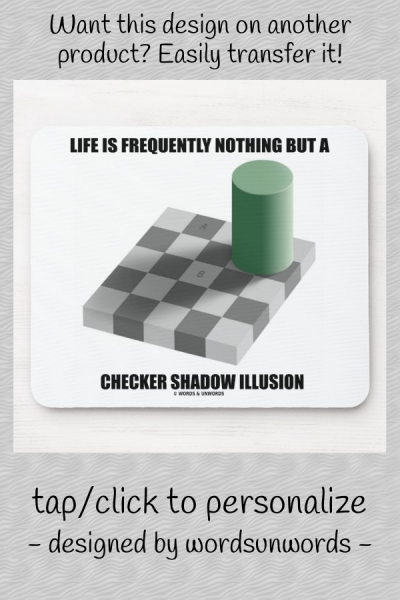 Many believe that the checkers are of different color due to the shadow but these are actually the same color! Showcase optical illusion visual fun with any of these gifts with the wry saying: "Life Is Frequently Nothing But A Checker Shadow Illusion". Psychology humor for all who know about the sameness found in life! myOpticalIllusion