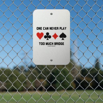 If you feel that you can never play too much bridge and play into the wee hours of the morning in bridge tournaments you'll enjoy this metal parking sign featuring the four card suits along with the saying "One Can Never Play Too Much Bridge". Make others do a double-take with a dose of tongue-in-cheek bridge / duplicate bridge style today with this metal sign! myBridgePlayer