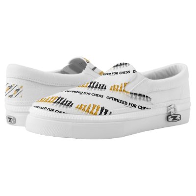Showcase your wry chess attitude with this chess saying pair of slip-on sneakers featuring a reflective chess set and the caption "Optimized For Chess". Memorable chess humor pair of slip-on sneakers for any avid chess player or chess teacher! myChess