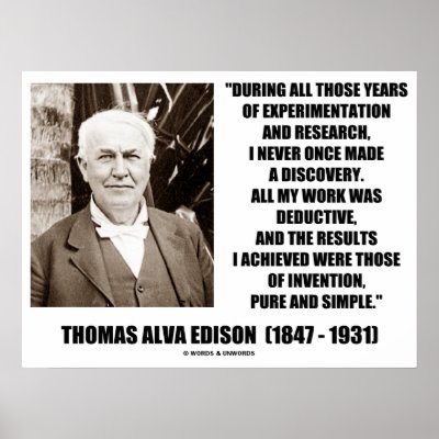 If you love to invent you'll enjoy this poster featuring the timeless words of wisdom quote by Thomas Edison who noted the following: "During all those years of experimentation and research I never once made a discovery. All my work was deductive and the results I achieved were those of invention pure and simple." Showcase the power of invention with this motivational and inspirational Edison quote poster! myWork