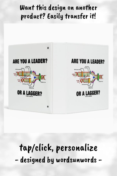 DNA replication humor and genetics attitude comes alive on this binder featuring DNA replication along with the following query: "Are You A Leader? Or A Lagger?" No matter what you do for a living question yourselves and others with this ponderous educational scientific quote featuring DNA replication and all of its parts -- including the leading strand and the lagging strand. Make others do a double-take at where they are going in life with a dose of genetic attitude! myMolecularBiology
