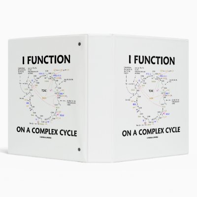 Do you function on a complex cycle? You'll enjoy this biochemistry humor binder featuring the Krebs cycle (also known as the citric acid cycle or tricarboxylic acid cycle) with the saying "I Function On A Complex Cycle". Showcase the complexity of your operating innards today. Science attitude binder for anyone who functions on a complex cycle -- no matter what schedule you are following! myBiochemistry