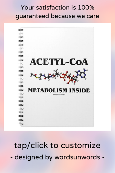 If you metabolize then you should be familiar with acetyl-CoA the molecule that is key to metabolism. Showcase wry intelligent chemistry attitude with this notebook that feature a 3-D molecule of acetyl-CoA along with the saying "Metabolism Inside". No need to be a biochemistry major to enjoy! myMolecularBiology