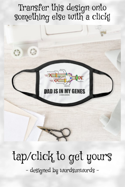 No need to be a father or to have a living Dad to enjoy this wry molecular biology DNA replication cotton/polyester face mask with the saying "Dad Is In My Genes". Comes with all key labels in DNA replication. Make others do a double-take with this scientific truism. Perfect "Father's Day" cotton/polyester face mask for anyone who has Dad on his or her mind! myMolecularBiology