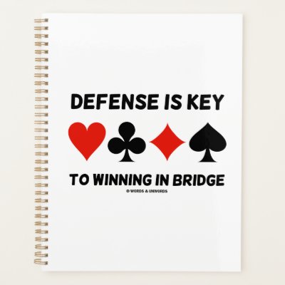 Are you and your bridge partner good in playing defense? If you love to defend you'll enjoy this bridge attitude planner featuring the four card suits along with the bridge truism saying "Defense Is Key To Winning In Bridge". Do a double-take with a dose of sound bridge attitude with this bridge/duplicate bridge saying planner. No need to be a bridge teacher to enjoy. myBridgePlayer