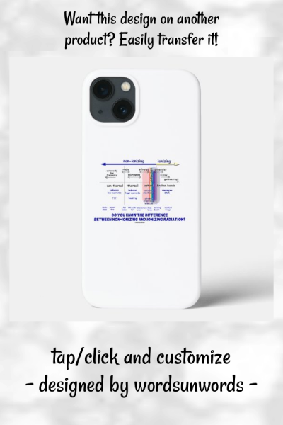 Showcase your wry electromagnetic physics sense of humor with this educational scientific iPhone 13 case featuring the electromagnetic spectrum along with labels for non-ionizing and ionizing radiation. Includes the caption that will make others do a double-take whenever they think about radiation: "Do You Know The Difference Between Non-Ionizing And Ionizing Radiation?" myPhysics