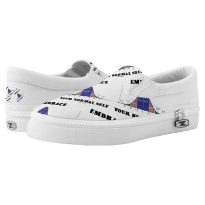 No need to be a statistician or psychologist to enjoy wry statistical humor with this pair of slip-on sneakers featuring the bell curve distribution (also known as the Gaussian curve normal distribution curve) along with the following saying that will make others do a double-take: "Embrace Your Normal Self". Classic geek humor slip-on sneakers for anyone who embraces one's own normal self with a dose of psychological statistical attitude style! myStatistician