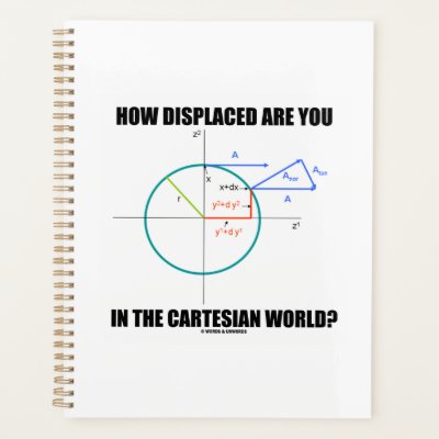 Wry mathematical graph humor comes alive on this design featuring parallel displacement along with the math truism query "How Displaced Are You In The Cartesian World?" Colorful educational geometry / trigonometry design. Perfect planner for any geek who feels displaced in the Cartesian world! myMathematician