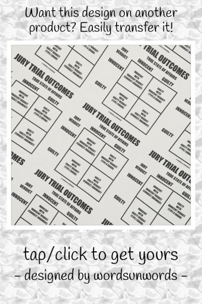 No need to have done jury duty to enjoy this educational statistical error summarized "Jury Trial Outcomes" fabric featuring jury verdict versus true state. Fabric for anyone who knows about hypothesis testing outcomes as applied to guilty or innocent verdicts in the court system. Make others do a double-take about jury trial outcomes the next time you create and make with this informative fabric. myMathematician