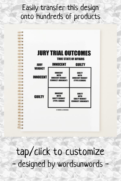 No need to have done jury duty to enjoy this educational statistical error summarized "Jury Trial Outcomes" planner featuring jury verdict versus true state. Planner for anyone who knows about hypothesis testing outcomes as applied to guilty or innocent verdicts in the court system. myMathematician