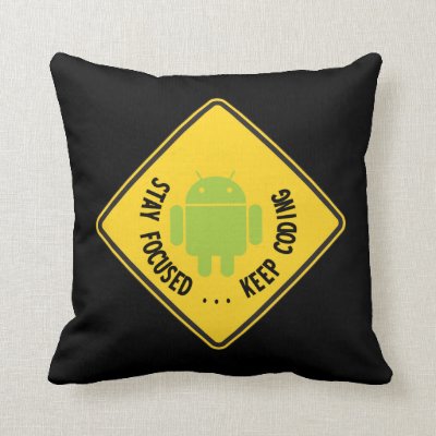 Do you work in software development on the Android platform? Are you constantly fighting fires? Or providing a warning to others? No need to be head honcho of your software development team to enjoy wry Android humor with this pillow featuring Bug Droid on a yellow diamond warning sign along with the sound advice "Stay Focused ... Keep Coding". Make others do a double-take on what software developers and software engineers do a daily basis with a dose of geek humor the next time you take a nap! Note: Portions of this page are modifications based on work ([--]) created and shared by Google and used according to terms described in the Creative Commons 3.0 Attribution License ([--]). myProgrammer