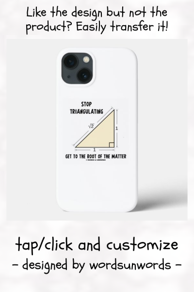 Do you like doing research -- i.e. triangulating your sources? No need to be a mathematician or geometrician to enjoy wry math and geometry humor iPhone 13 case featuring an isosceles triangle along with the saying that will make others do a double-take at what you are trying to mean: "Stop Triangulating Get To The Root Of The Matter". Memorable tongue-in-cheek Euclidean humor geometry iPhone 13 case. myMathematician
