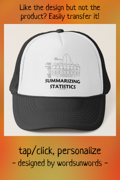 If you work with statistics all day you'll enjoy this wry statistical attitude hat featuring the normal distribution curve along with the truism caption "Summarizing Statistics". Complete with z-scores and p-values. Make others do a double-take when you try to explain statistics with educational tongue-in-cheek fun! myMathematician