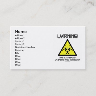 If you work with biohazards you'll enjoy wry signage humor the next time you introduce yourself with these business cards featuring the biohazard warning sign. Comes with the saying that may or may not be true: "Warning! May Be Considered Weapon Of Mass Destruction". Make others wonder what you mean with a dose of geek humor today! myWarning