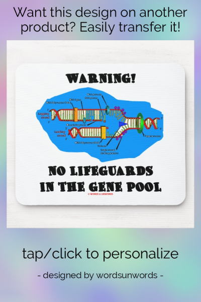 No need to be a biologist or geneticist to enjoy wry science humor with this molecular biology attitude mousepad featuring DNA replication complete with all key labels. Comes with the often-heard saying "Warning! No Lifeguards In The Gene Pool". Make others do a double-take about exactly what you mean with a dose of scientific attitude today! myWarning