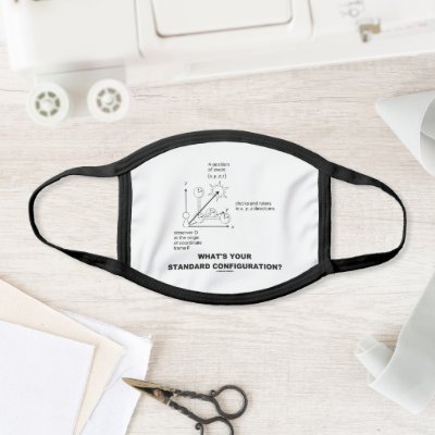 Showcase your wry physics sense of humor with this cotton/polyester face mask featuring the query "What's Your Standard Configuration?" An observer O situated at the origin of a local set of coordinates - a frame of reference F. The observer in this frame uses the coordinates (x y z t) to describe a spacetime event shown as a star. Make others do a double-take with a dose of existential Cartesian coordinate humor today! myPhysics