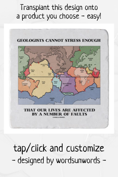 Showcase your wry geological and earth scientific side with this plate tectonics attitude trivet featuring a map of the world's tectonic plates along with the following scientific truism saying: "Geologists Cannot Stress Enough That Our Lives Are Affected By A Number Of Faults". myEarthScience