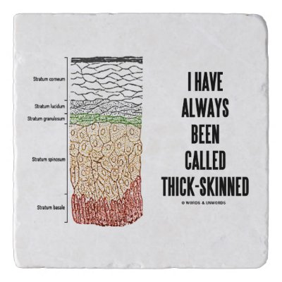 Are you a thick-skinned person? Showcase your mettle with a dose of wry anatomical humor with this trivet featuring the five layers of the epidermis the largest organ of the human body along with the truism saying "I Have Always Been Called Thick-Skinned". Make others do a double-take with tongue-in-cheek educational health and medicine humor today! Memorable trivet for any athlete entrepreneur or anyone who has been called thick-skinned! myAnatomical