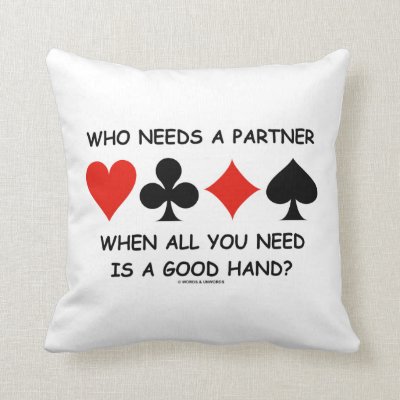 Make others do a double-take with a dose of wry bridge attitude with this throw pillow featuring the four card suits along with the following bridge humor saying: "Who Needs A Partner When All You Need Is A Good Hand?" myBridgePlayer