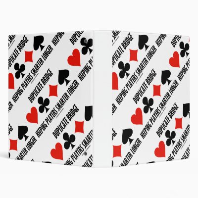 Any duplicate bridge player will enjoy this binder featuring the four card suits along with the following bridge saying that will definitely be a conversation point at the bridge table and beyond: "Duplicate Bridge Keeping Players Smarter Longer". Great binder gift for any avid bridge player or bridge teacher! myBridgePlayer