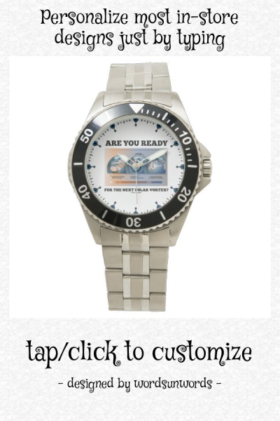 Have you experienced very bone chilling sub zero weather recently? Let your wry meteorological side shine with this watch featuring the development of the polar vortex along with the following scientific query: "Are You Ready For The Next Polar Vortex?" Do a double-take on the effects of global warming with a dose of scientific attitude today the next time you tell time with this watch! myEarthScience