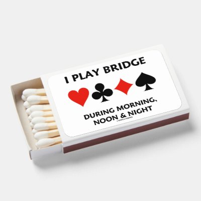Showcase your wry bridge / duplicate bridge sense of humor at bridge tournaments with this matchbox featuring the four card suits along with the following saying for avid bridge tournament attendees: "I Play Bridge During Morning Noon & Night". Make others do a double-take at your mental stamina for the game of bridge with this bridge saying matchbox! myBridgePlayer
