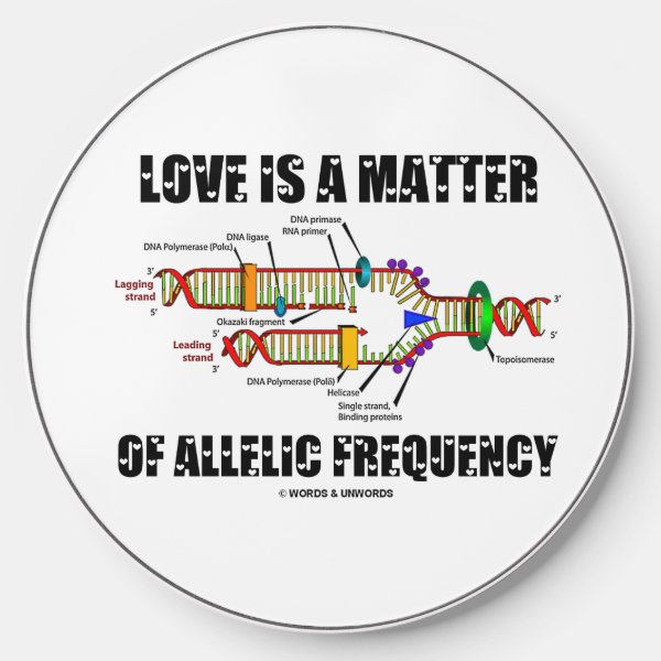 Face it -- love is truly a matter of allelic frequency, as love starts in the genes. Allelic frequency is the proportion of all copies of a gene that is made up of a particular gene variant (allele). Showcase wry biological attitude with this wireless charger featuring DNA replication, complete with key labels, along with the truism saying "Love Is A Matter Of Allelic Frequency" in Love Letters font. No need to be a biologist or geneticist to understand that genes, alleles, and probability play a role in biological love at the level of the individual and population! myMolecularBiology
