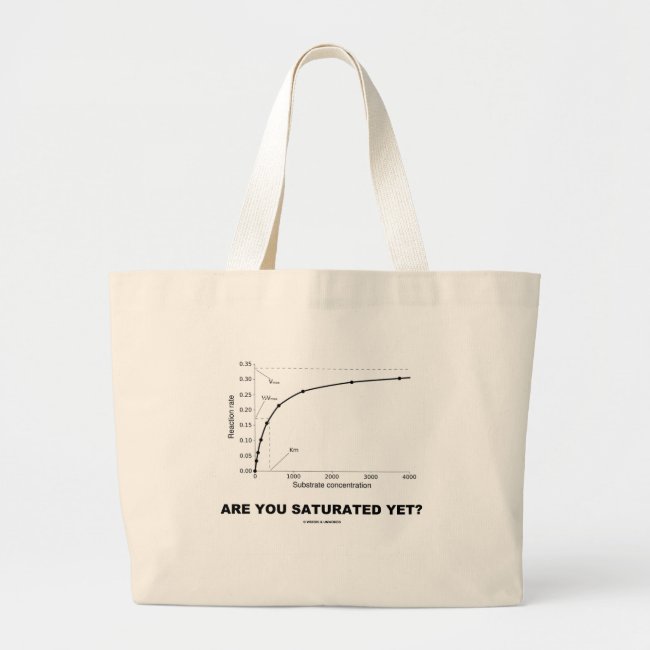Do you feel saturated by life? Are you saturated by chemistry? Showcase your wry geek side with this tongue-in-cheek biochemistry / chemistry tote bag featuring a graph of the substrate concentration versus the reaction rate. Caption says it all: "Are You Saturated Yet?" Make others do a double-take with this enzyme kinetics humor tote bag today! myBiochemistry