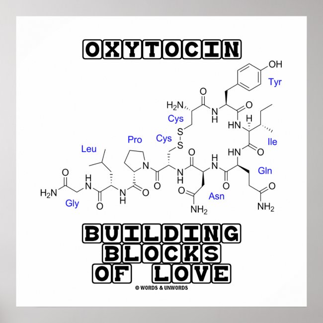No need to be a chemist or biochemist to know about the peptide hormone oxytocin known as the "Building Blocks Of Love". Make others do a double-take with a dose of scientific attitude over the true origins of love today! Memorable geek humor poster for Valentine's Day Mother's Day etc.! myBiochemistry