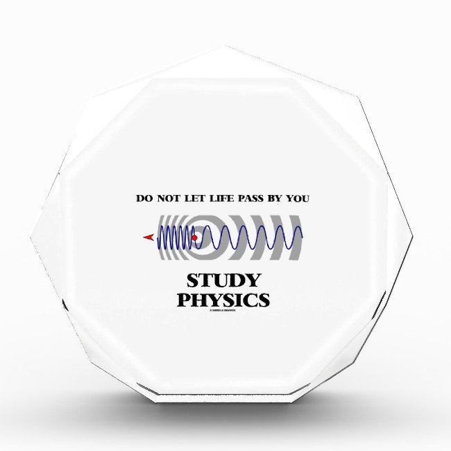 Showcase your wry twisted physics attitude with this acrylic award featuring the Doppler Effect along with the double-entendre saying that will make others do a double-take on the subject of physics: "Do Not Let Life Pass By You Study Physics". Note: There is no error in the saying "Do Not Let Life Pass By You" as opposed to the common saying of "do not let life pass you by". You'll need to seize the moment with a dose of physics humor with this acrylic award which promotes the study of physics! myPhysics