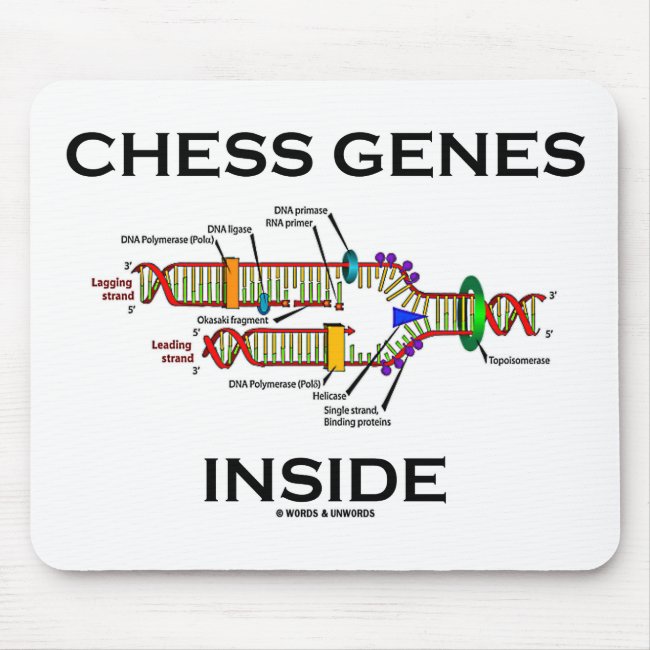 Are you a chess player who believes that you're genetically wired to play chess? Showcase your wry DNA replication attitude with a dose of chess humor with this mousepad featuring all key parts of DNA replication along with the saying "Chess Genes Inside". Make others do a double-take with a dose of educational chess attitude today! No need to have parents who are chess players. myChess