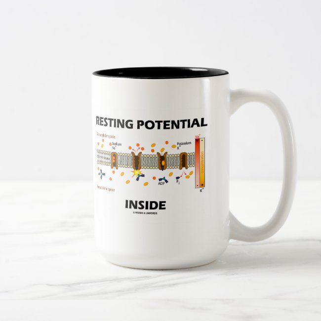 Showcase your wry biology geek sense of humor with this mug featuring the sodium-potassium pump of active transport along with the following scientific truism caption: "Resting Potential Inside". No need to be a cell biologist to enjoy! myBiochemistry