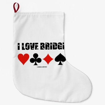 Do you love the game of bridge? Showcase your love for the game of bridge with this xMas stocking featuring the four card suits along with the following bridge saying in Love Letters font: "I Love Bridge". Memorable bridge saying xMas stocking for any avid bridge / duplicate bridge player! myBridgeTeacher