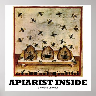 If you are a beekeeper -- i.e. apiarist -- you'll enjoy this poster featuring a 14th century picture of three beehives along with bees in the air along with the caption "Apiarist Inside". Beginning and experienced apiarists will enjoy this vintage illustration featuring this timeless agricultural phenomenon known as beekeeping! myBeekeeper