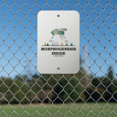 No need to be a molecular biology to enjoy wry scientific educational attitude with this metal parking sign featuring the homeobox genes of a fruit fly along with the saying "Morphogenesis Inside". For the record a homeobox is a DNA sequence found within genes that are involved in the regulation of patterns of development (morphogenesis) in organisms. Make others do a double-take with tongue-in-cheek biological humor with this metal parking sign! Memorable metal parking sign for anyone still developing and changing -- whether one's ideas or oneself. myMolecularBiology