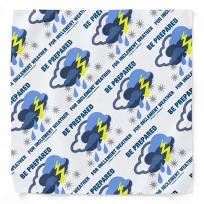 If you enjoy discussing the weather and are prepared for all types of inclement weather you'll enjoy this bandana featuring a bunch of clouds with rain snow and a lightning bolt descending from them along with the sound weather advice: "Be Prepared For Inclement Weather". Make others do a double-take at what conditions they should be prepared for -- no matter what season time of day or geographic location -- with this memorable weather saying bandana! myMeteorologist