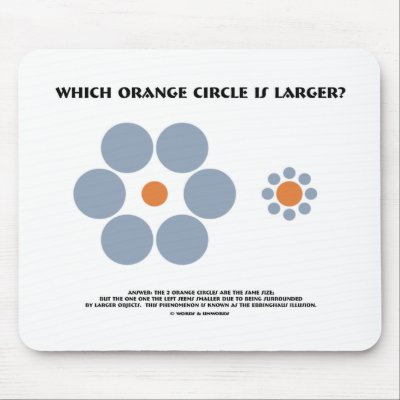 Ask yourself and others this key question: Which orange circle is larger? Showcase the Ebbinghaus illusion with a dose of relative fun on this mousepad. Caption explains the optical illusion: "Answer: The 2 orange circles are the same size but the one on the left seems smaller due to being surrounded by larger objects. This phenomenon is known as the Ebbinghaus illusion." Also known as Titchener circles. Educational optical illusion mousepad for anyone who enjoys visual humor. Make others do a double-take and look again and again today! myOpticalIllusion