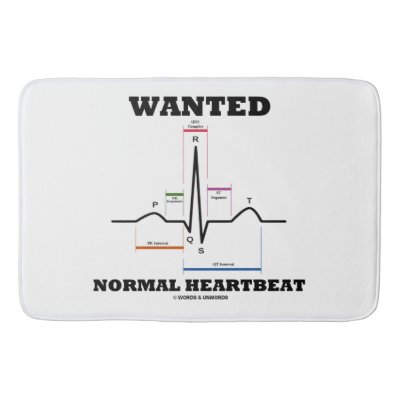 If you have an abnormal heartbeat -- whether due to congenital defect or being in love -- you'll enjoy this wry medical humor ECG/EKG bathmat featuring a normal heartbeat on an electrocardiogram along with the saying "Wanted Normal Heartbeat". Bath mat for anyone who has a heartbeat and desires to display educational medical attitude! No need to work in a health profession to enjoy! myHeartbeat