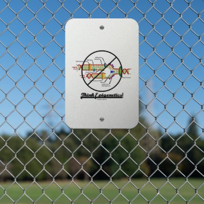 DNA is not everything. Showcase this fact with this wry molecular biology metal parking sign featuring DNA replication along with a cross out with the saying "Think Epigenetics!" Metal parking sign with wry scientific attitude for anyone who understands that it is the environmental interaction with genes that is important -- not the genes or the DNA code all by itself! Tongue-in-cheek humor for anyone who knows about how evolution occurs! myEvolution