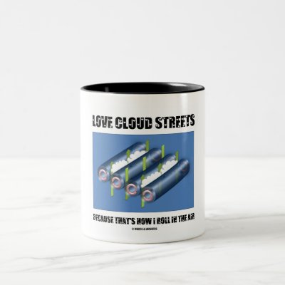 Make others do a double-take with a dose of meteorological attitude with this mug featuring horizontal convective rolls along with the following saying: "Love Cloud Streets Because That's How I Roll In The Air". No need to be a pilot or meteorologist to enjoy! myMeteorologist