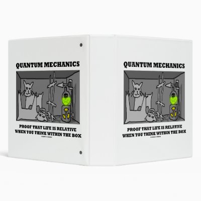 No need to think outside of the box to enjoy this quantum mechanics / quantum physics saying featuring the subject of entanglement with Schrödinger's Cat. Make others do a double-take with a dose of tongue-in-cheek physics humor with this binder featuring the Copenhagen interpretation of quantum mechanics along with the following saying: "Quantum Mechanics Proof That Life Is Relative When You Think Within The Box". Classic geek humor binder for anyone who thinks both within the box (within a discipline) and outside of the box! myPhysics