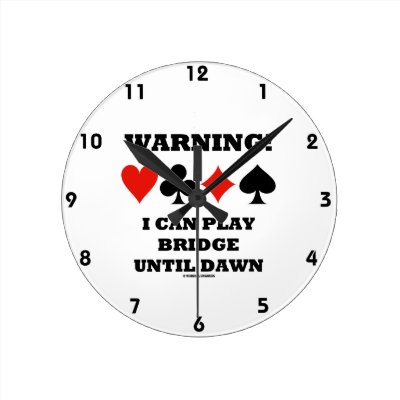 Showcase your wry bridge attitude with this clock featuring the four card suits along with the following bridge saying that is often heard at bridge tournaments with sessions that last after midnight: "Warning! I Can Play Bridge Until Dawn". myWarning