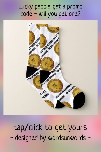 Mathematicians will enjoy this pair of socks with the wry geek humor saying "My Life Is Nothing More Than A Pi Filled Existence". Word play socks on the word pi / pie featuring pi on a baked pie. Memorable philosophical socks for anyone who can't help but think about pi especially when eating pie! myMathematician