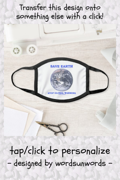 Environmental attitude comes alive on this cotton/polyester face mask featuring the infamous "Blue Marble Earth" picture as taken from outer space. Make others do a double-take with this inspirational environmental truism slogan "Save Earth Stop Global Warming". Face mask for anyone who advocates policies to halt the increase in global warming that is sure to come. A memorable cotton/polyester face mask for anyone who loves planet Earth! myEarthScience