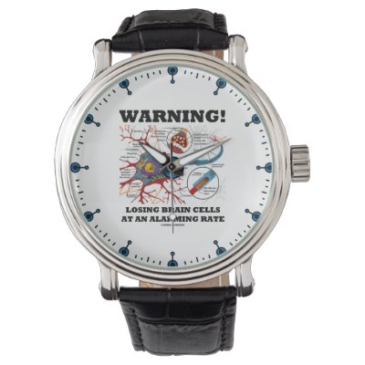 Are you losing your memory? Are you forgetful at times? No need to be in the early stages of Alzheimer's disease to enjoy wry anatomical neuron / synapse humor with this watch featuring the tongue-in-cheek (but all too true!) saying "Warning! Losing Brain Cells At An Alarming Rate". Make others do a double-take about the act of thinking with their brain whenever you tell time with this scientific educational attitude watch today! myWarning