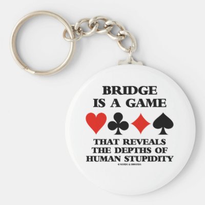 If you have ever made a stupid mistake -- whether in defense or playing as declarer -- when playing the game of the bridge you'll enjoy any of these gifts featuring the four card suits along with the following humorous bridge saying: "Bridge Is A Game That Reveals Depths Of Human Stupidity". Make others do a double-take with a dose of tongue-in-cheek bridge attitude at the bridge table with any of these timeless bridge saying gifts! myBridgePlayer