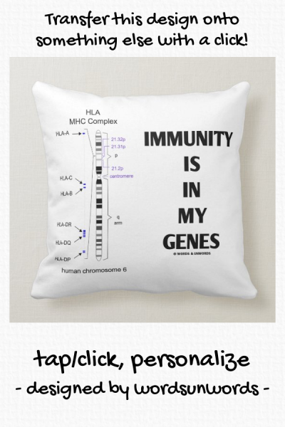 Showcase your knowledge of the major histocompatibility complex (MHC) -- also known as the human leukocyte antigen (HLA) -- with this biology humor throw pillow featuring the various genes of the HLA on human chromosome 6 along with the saying "Immunity Is In My Genes". myMolecularBiology