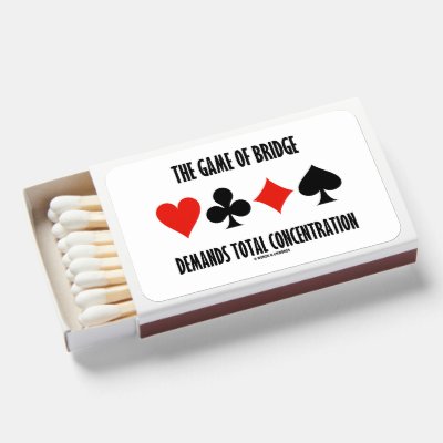Avid bridge players and bridge teachers will enjoy this matchbox featuring the four card suits along with the following sound bridge advice and observation: "The Game Of Bridge Demands Total Concentration". Make others do a double-take at the skill that bridge players take a lot of time to master whenever they play bridge with this matchbox! myBridgePlayer
